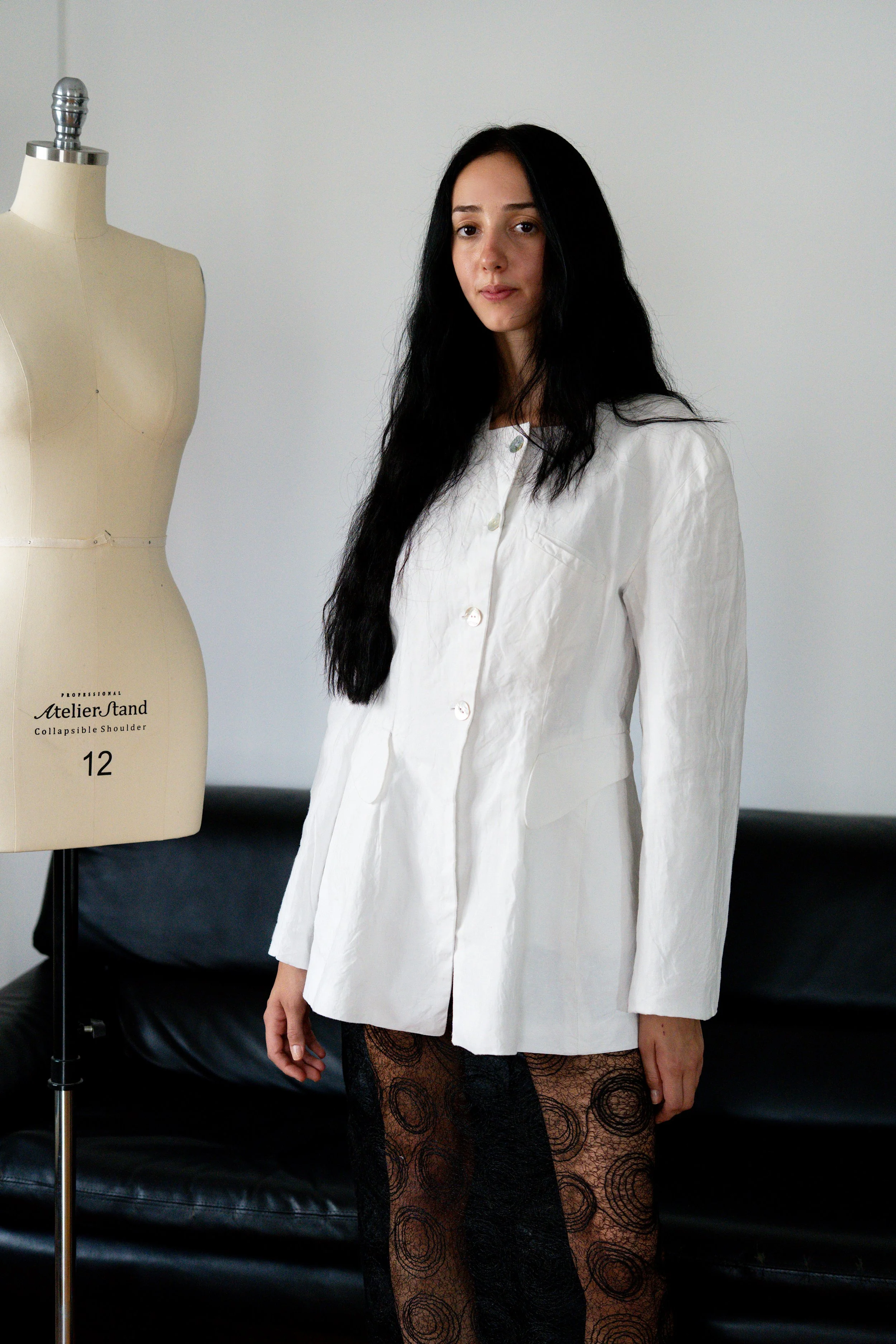 Sculpted Plissé Blouse (Pre-Order) €170.00 Porcelain Doll Corset (Pre-Order) €264.00 Plissé Maxi Skirt (Pre-Order) €195.00 Naval Tailored Trousers - One of a Kind €340.00 Soft Armour Bomber Jacket (Pre-Order) €285.00 Contemporary Bohemian Dress (Pre-Order) €285.00 Poet Tailored Vest (SS26 Pre-Order) €160.00 Uzumaki Dress - One of a Kind €294.00 Peculiar Blouse (Pre-Order) €130.00 Architectural Wool Jacket - One of a Kind €330.00 Tailored Bermuda Shorts (SS26 Pre-Order) €245.00 Softly Tailored Neapolitan Jacket (SS26 Pre-Order) €395.00